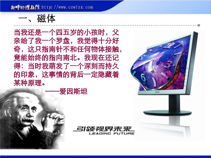 【内容简介】本课件以苏科版教材第十六章第一节为基础制作,共有22张幻灯片、1个flash和3个视频组成。课件引导学生认识了磁体的性质及磁性的概念,展示了什么磁极是怎样规定的,探究了磁体的指向性和磁极间的相互作用,通过实验让学生了解了磁场的存在,并讨论了如何用磁感线描述磁场,展示了磁的重要应用等。