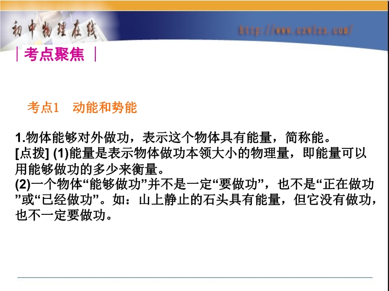 【内容简介】2013年北师大版中考物理复习课件,课件共19张幻灯片,课件引导学生复习了中考重点章节知识点:内能和机械能,引导学生区分了这两种重要的能以及他们之间的联系,重点解析了中考命题的走向,精选了2012中考试题供教学参考使用,从习题中谈中考。课件设计合理科学,值得借鉴。