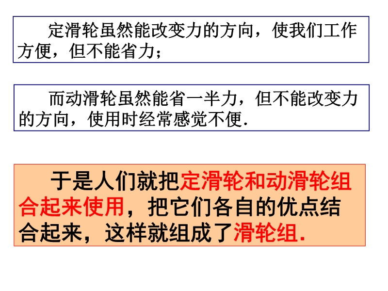 【内容简介】沪科版《10.2滑轮及其应用》(第2课时)ppt+flash课件,本课件以沪科版新教材第十章第二节为基础制作,共有37张幻灯片,并插入了一个flash动画。课件引导学生讨论了滑轮组的使用,并用flash动画作了模拟演示,课件还引导学生通过实验探究了滑轮组的使用特点,课件中精选了典型的例题和习题,还有中考题型。课件制作新颖、生动,可供教学“滑轮组”时参考使用。