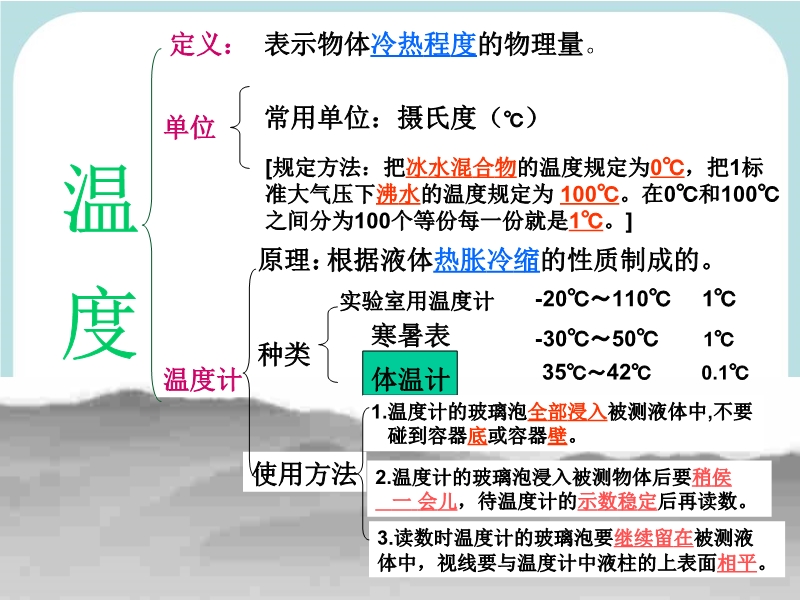 【内容简介】2013年中考复习课件《物态变化》ppt复习课件,本课件以人教版教材第四章为基础制作,共有37张幻灯片。课件主要引导学生系统地回顾了本章知识,课件详细引导学生复习了每个知识板块的基础内容,并精选了适量的例题和习题,具有很强的针对性,也能提高学生的能力。