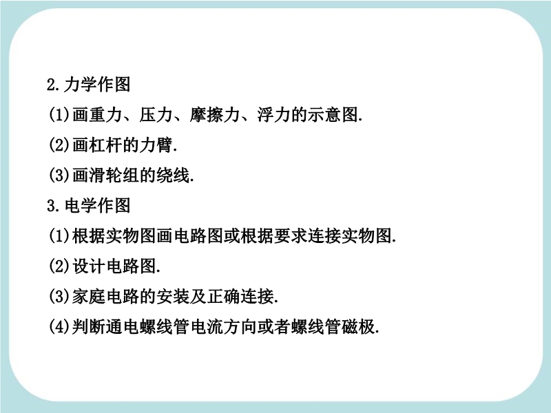 利用透镜对光的作用作图 画重力、拉力、压力、摩擦力、浮力的示意图 画杠杆的力臂 根据实物图画电路图或根据要求连接实物图 设计电路图,本环节是以中考试题的展示和评析为手段,提高学生的运用知识的能力。