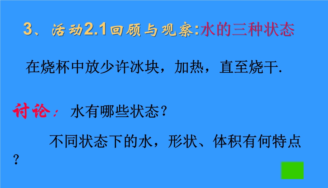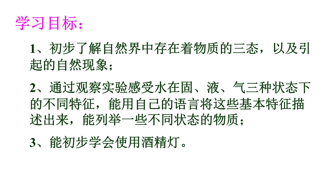 【内容简介】本课件以苏科版新教材第二章第一节《2.1物质的三态 温度的测量》为基础制作,共有20张幻灯片。课件主要引导学生认识了物质的三种状态,并认识了每种状态的特征,展示了水的三种状态在自然界中的各种存在形式,如雨、雪、霜、雾、露等,让学生进一步认识了物质的状态与温度的关系。本课件可供本节教学第1课时使用。