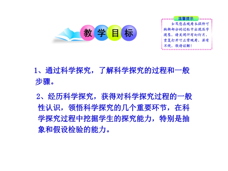 【内容简介】沪粤版《1.4尝试科学探究》ppt课件,本课件以沪粤版八年级新教材第一章第四节为基础制作,共有27张幻灯片。兴趣是最好的老师,课件展示了一些奇妙的物理现象,激发学生学习物理的兴趣;让学生经历科学探究,获得对科学探究过程的一般性认识,领悟科学探究的几个重要环节,注重培养学生的抽象和假设检验的能力。