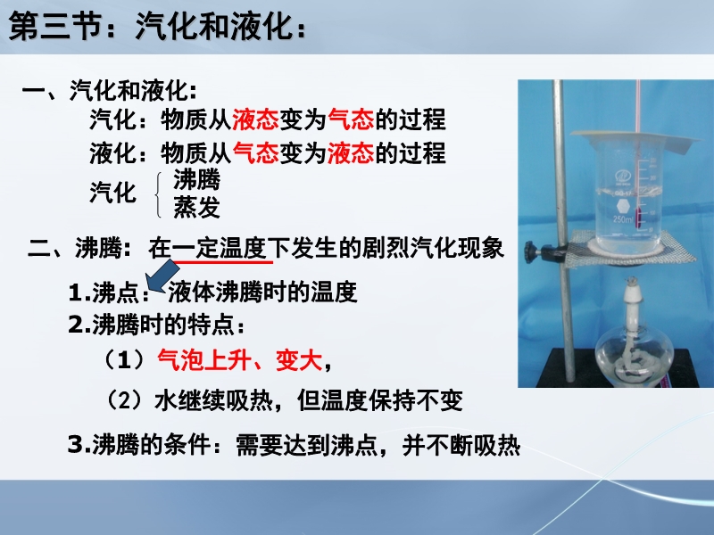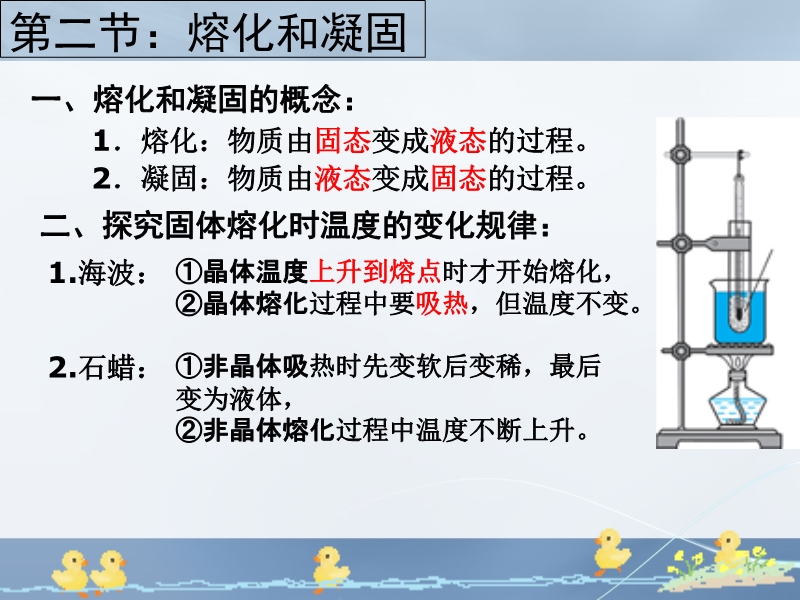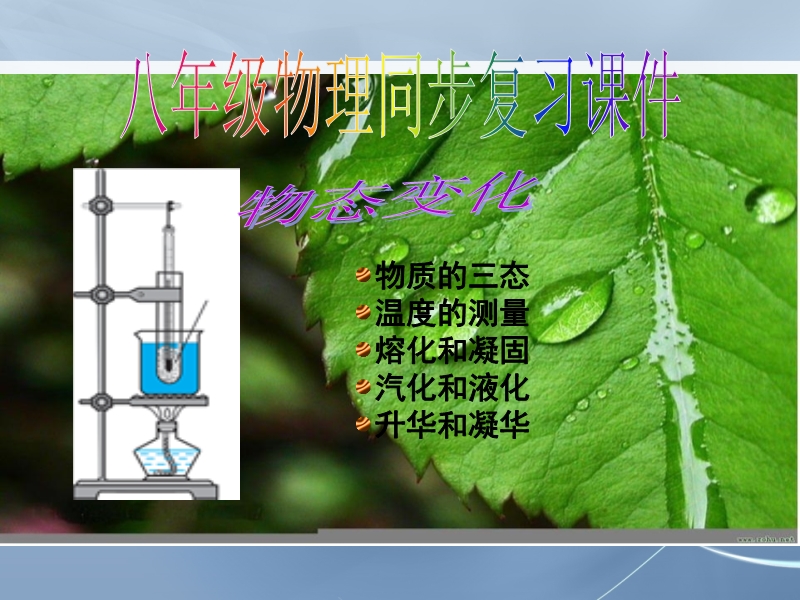 【内容简介】新人教版复习课件《第三章 物态变化》ppt课件,课件根据人教版第三章内容教材制作,共23张幻灯片,课件引导学生复习了:物质的三态 温度的测量 熔化和凝固 汽化和液化 升华和凝华等本章知识点,课件对教材的重点复习以试题出现的形式展示,通过大量的训练提高学生的应用知识的能力。
