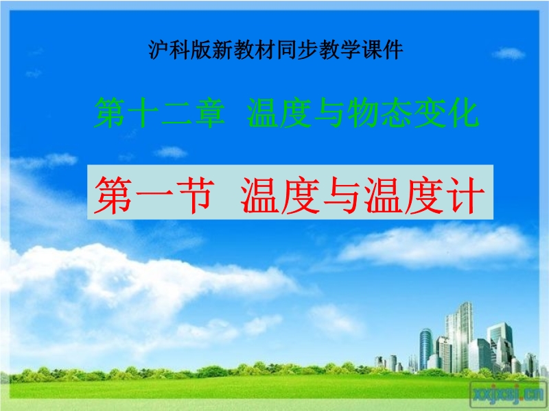 【内容简介】本课件以沪科版新教材第十二章第一节《12.1温度与温度计》为基础制作,共有60张幻灯片。课件用图片展示了水在自然界中的几种存在形式,用flash动画模拟演示了自然界中的水循环,课件还引导学生用实验探究了水的物态变化,让学生认识了物质的三态,了解了物态变化的条件。课件还引导学生认识了温度的意义,温度的常用单位,展示了温度计,并讨论了温度计的使用等。本课件可供教学“温度温度计”时参考使用。