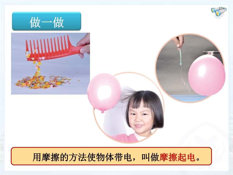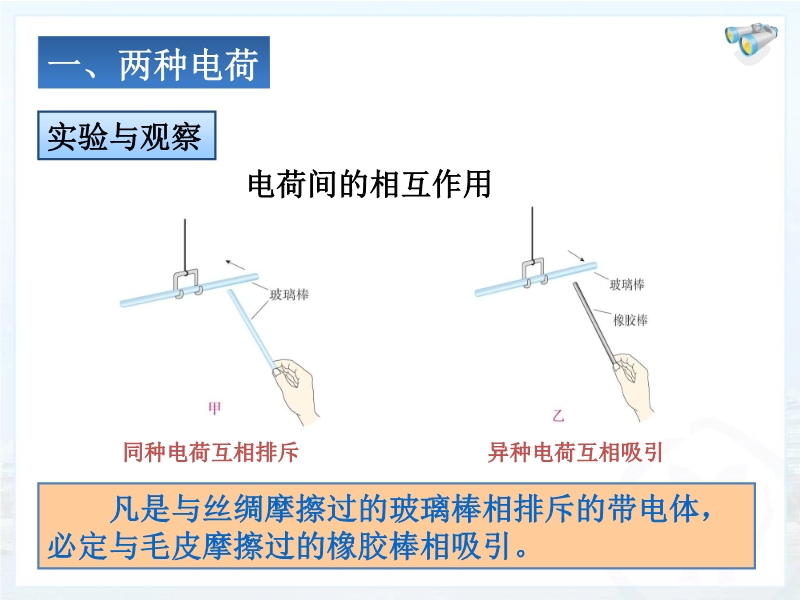 【内容简介】人教版《15.1两种电荷》ppt+视频课件,本课件以人教版新教材第十五章第一节为基础制作,共由18张幻灯片组成和2个视频,课件引导学生通过观察现象认识了摩擦起电现象、物体带电的现象、电荷的概念等,引导学生通过实验探究了两种电荷的存在和电荷间的相互作用,探究了验电器的结构、原理和作用,课件还向学生介绍了元电荷的概念。