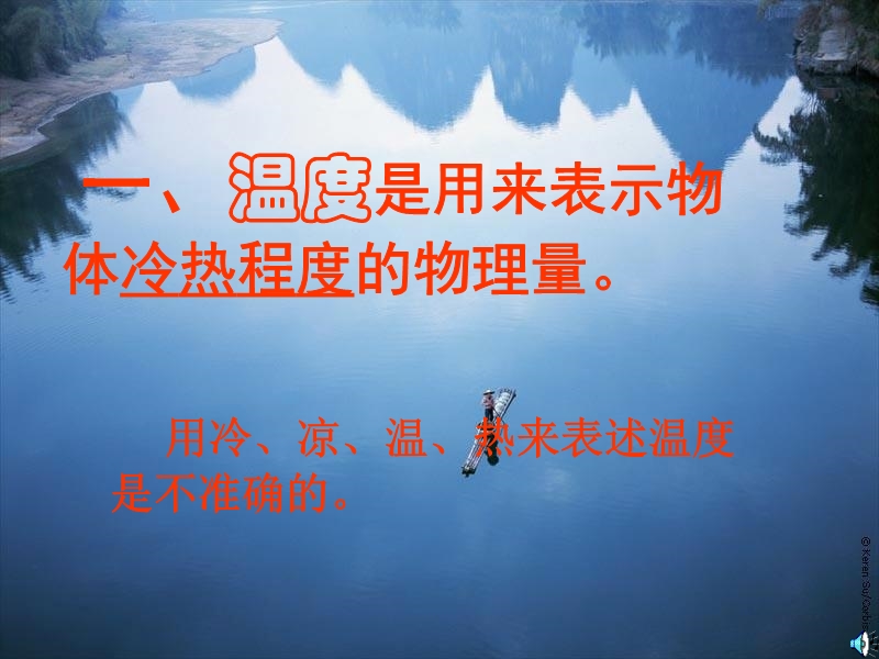 【内容简介】双柏县妥甸中学:人教版《3.1 温度》ppt课件,本课件以人教版新教材第三章第一节为基础制作,共有40张幻灯片。课件引导学生认识了温度、温度的测量工具:温度计的基本结构、原理,认识了几种常用的温度单位,重点引导学生学习了温度计的使用等。