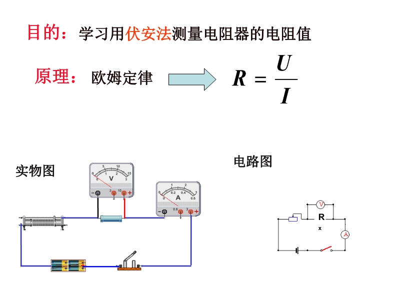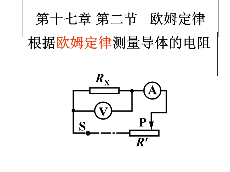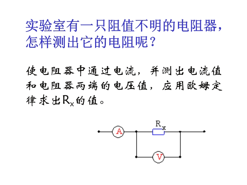 【内容简介】人教版《17.3电阻的测量》ppt+学案,本课件以人教版新教材第十七章第三节为基础制作,共有35张幻灯片。主要引导学生根据欧姆定律讨论如何测量导体的电阻,讨论了:原理、器材的选择、实验步骤、实验数据的分析等,最后课件第二课时是一个提高篇的课件《间接测量》,有39张幻灯片等,教学设计突出学生的主体地位和作用,充分发挥学生的主动学习性。