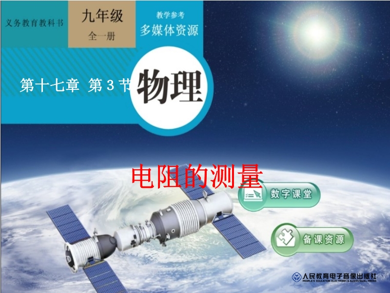 【内容简介】人教版:《17.3电阻的测量》ppt+视频课件,本课件以人教版新教材第十七章第三节为基础制作,共有17张幻灯片和1个视频文件。课件通过引导学生明确实验原理、选择实验器材、设计实验电路、进行实验等,让学生体验了科学探究的方法和过程。并且引导学生对实验结果进行了详细的讨论和分析,讨论了实验过程中应该注意的问题。