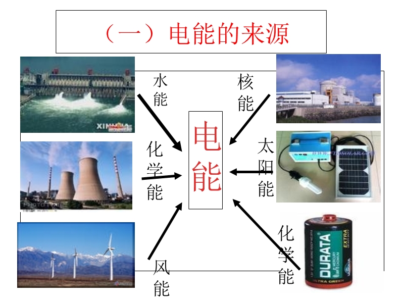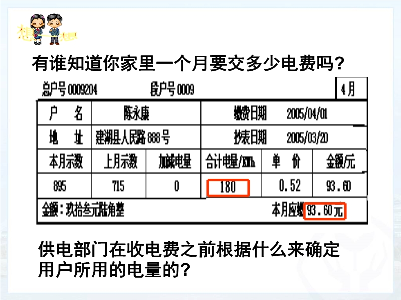 【内容简介】新人教版;《18.1电能电功》ppt课件,课件共有24张幻灯片,课件引导学生学习了电功的概念、意义、电功的计算,并引导学生认识了影响电功的因素等,课件向学生展示了各式各样的电能表,引导学生认识了电能表表盘上每个数字和字符的含义,课件中有例题和习题,制作较新颖。