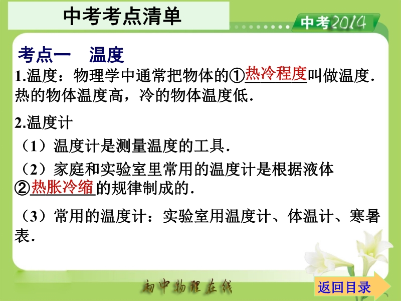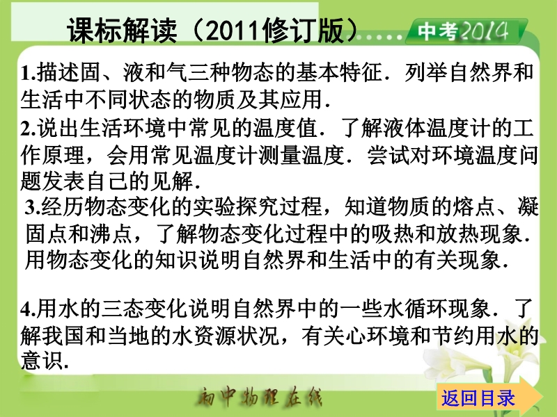 【内容简介】人教版2014中考备考策略《第3章 物态变化》ppt课件,课件根据现行的人教版教材编辑的2014年中考复习课件,课件45共ppt幻灯片,课件分为如下几个环节组织复习:一课标解读,解读课标,分析考试的要求,明确复习的目的, 二 中考考点清单,引导学生复习了:考点一 温度考点二 熔化和凝固 考点三 汽化和液化考点四 升华和凝华 三、常考类型剖析,解析中考常见题型。四实验突破,对涉及本章的实验进行复习。课件精选了难度适中的2013年全国中考试题,供教学参考使用。