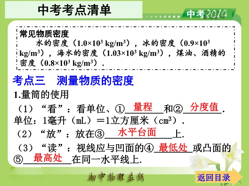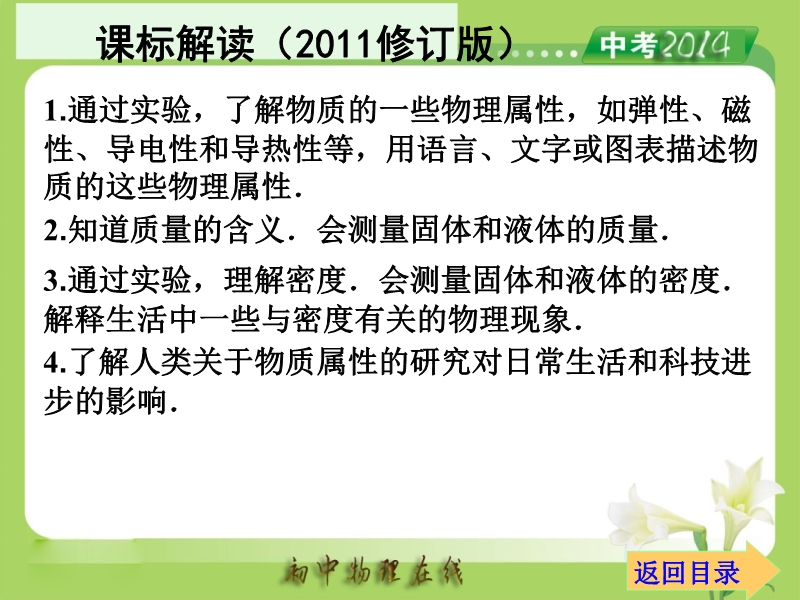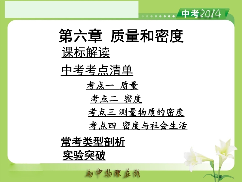 【内容简介】人教版2014中考备考策略《第6章 质量和密度》ppt课件,课件根据现行的人教版教材编辑的2014年中考复习课件,课件43张ppt幻灯片,课件分为如下几个环节组织复习:一课标解读,解读课标,分析考试的要求,明确复习的目的, 二 中考考点清单,引导学生复习了:考点一 质量 考点二 密度 考点三 测量物质的密度 考点四 密度与社会生活 三、常考类型剖析,解析中考常见题型。四实验突破,对涉及本章的实验进行复习。课件精选了难度适中的2013年全国中考试题,供教学参考使用。