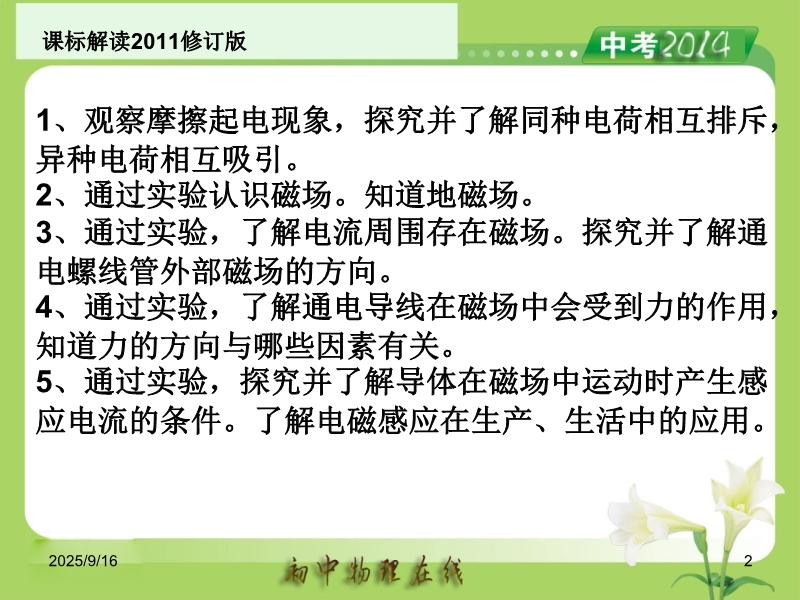 【内容简介】人教版2014中考备考策略《第20章 电与磁》ppt课件,课件根据现行的人教版教材编辑的2014年中考复习课件,课件共有52张ppt幻灯片,课件分为如下几个环节组织复习:一课标解读,解读课标,分析考试的要求,明确复习的目的, 二 中考考点清单,引导学生复习了:考点一 磁现象 磁场 考点二 电生磁考点三 电磁铁 电磁继电器考点四 电动机考点五 磁生电 三、常考类型剖析,解析中考常见题型。四实验突破,对涉及本章的实验进行复习。课件精选了难度适中的2013年全国中考试题,供教学参考使用。