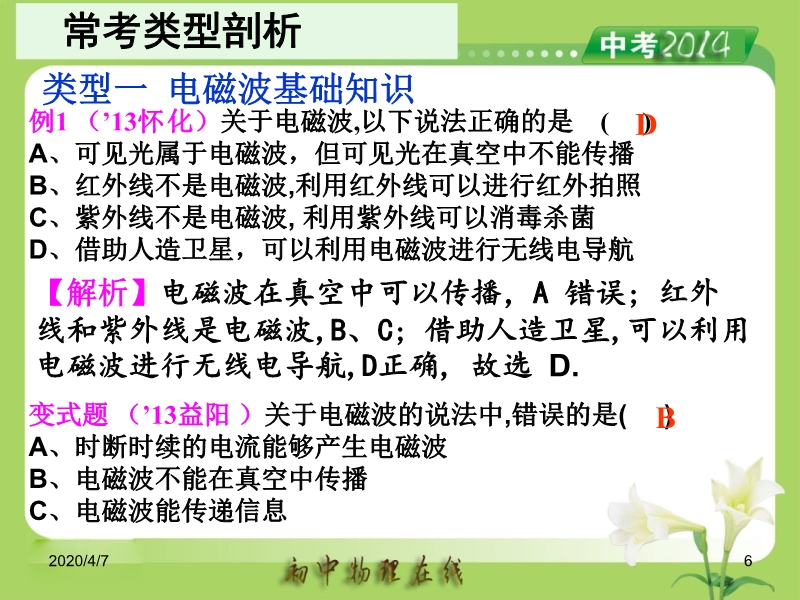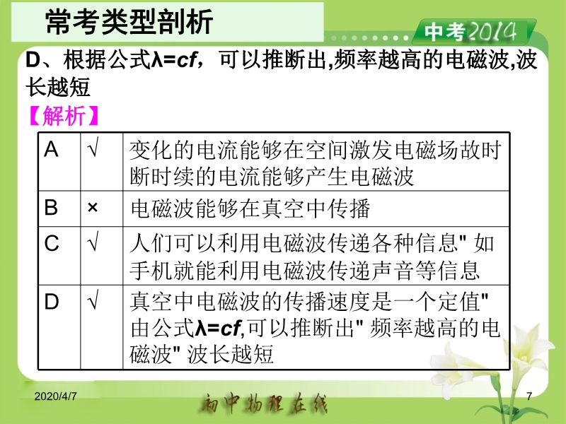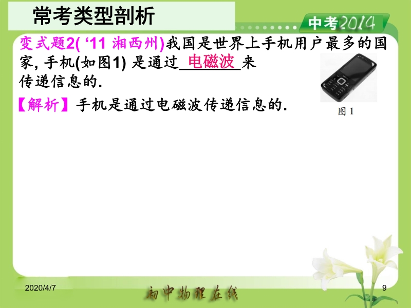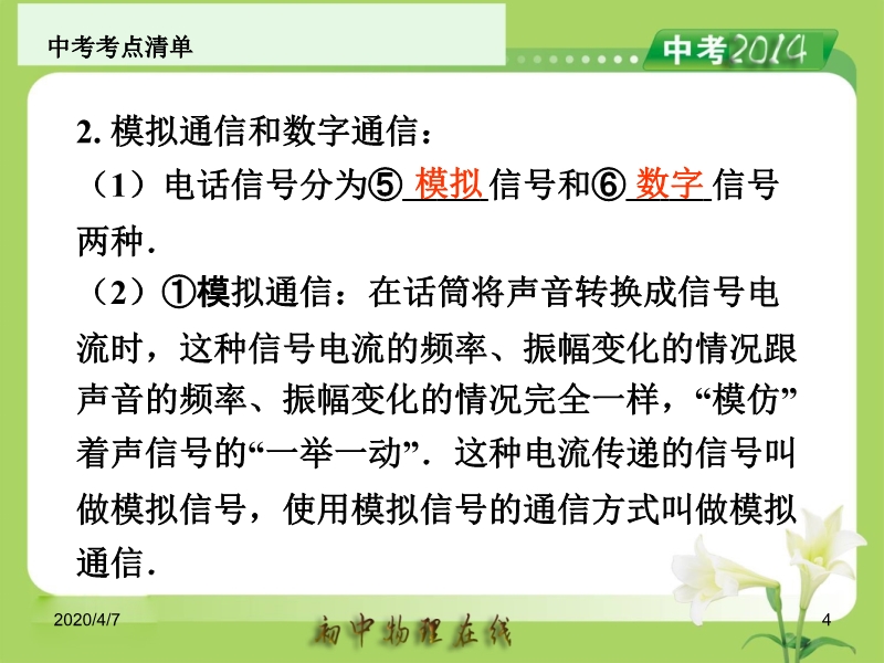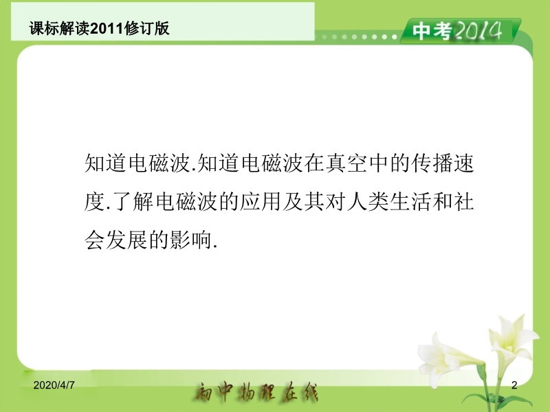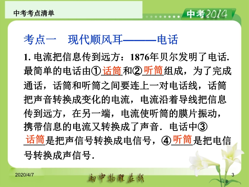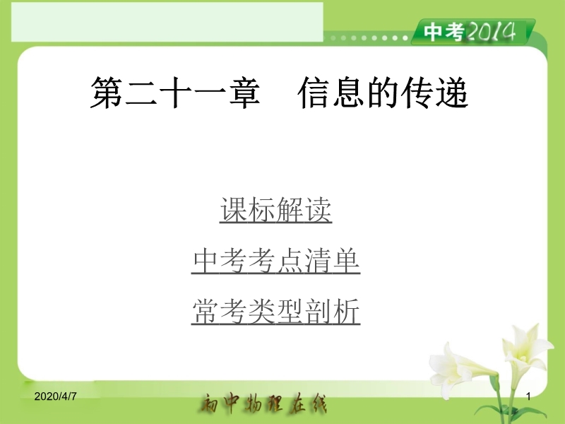 【内容简介】人教版2014中考备考策略《第21章 信息的传递》ppt课件,课件根据现行的人教版教材编辑的2014年中考复习课件,课件共有9张ppt幻灯片,课件分为如下几个环节组织复习:一课标解读,解读课标,分析考试的要求,明确复习的目的, 二 中考考点清单,引导学生复习了:考点一 现代顺风耳———电话三、常考类型剖析,解析中考常见题型。课件精选了难度适中的2013年全国中考试题,供教学参考使用。