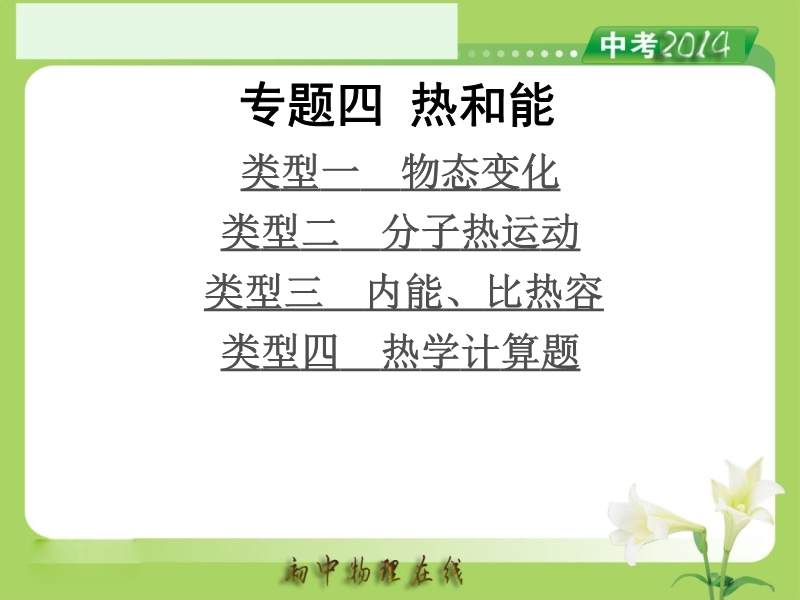【内容简介】人教版2014中考备考策略《专题4 热和能》ppt课件,课件根据现行的人教版教材编辑的2014年中考复习课件,课件共有52张ppt幻灯片,课件属于二轮综合复习课件课件,课件从如下几个专题组织学生复习:类型一 物态变化 类型二 分子热运动 类型三 内能、比热容 类型四 热学计算题。课件精选了难度适中的2013年全国中考试题,供教学参考使用。