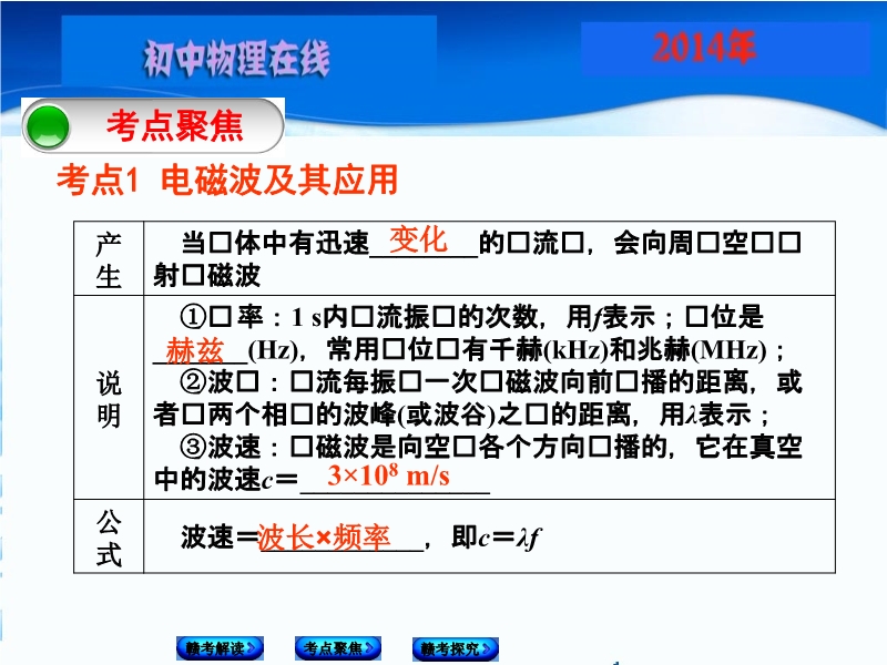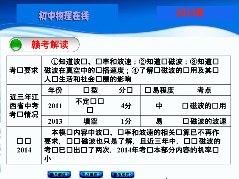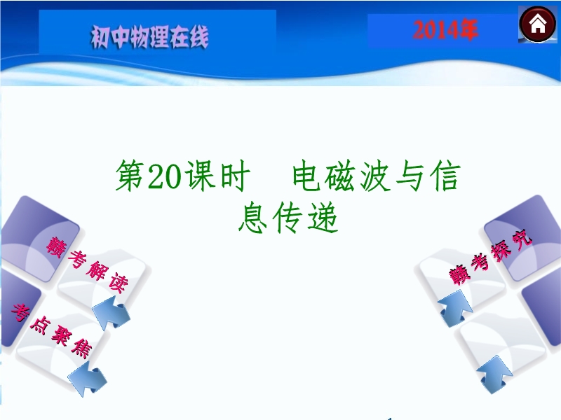 【内容简介】2014江西中考复习课件《第20课时 电磁波与信息传递》课件共14张幻灯片,课件从三个环节组织复习:1赣考解读 解读2011-2013三年江西省中考考查情况:题型、分值、难易程度和涉及的考点,预测了2014年江西省命题的形式、分值等。2 考点聚焦,本环节采用填空的形式,按知识点分别展示了:考点1 电磁波及其应用 考点2 信息的传递。2、赣考探究,以2011-2013年江西省省、各市试题中考试题载体展示常见的题型等,通过课件展示解析,总结方法,提高学生能力,供教学参考
