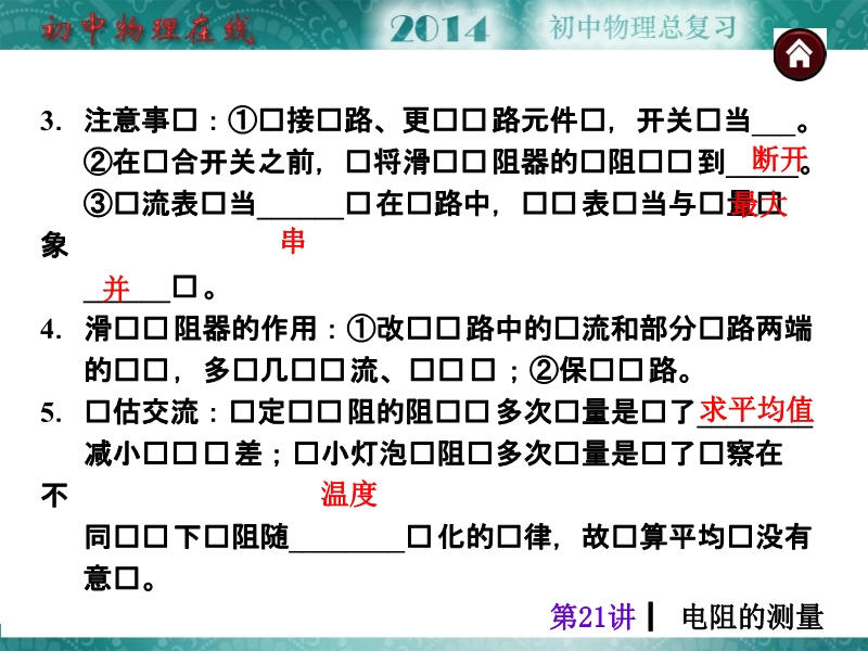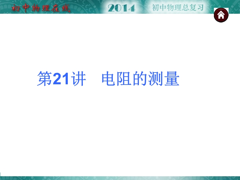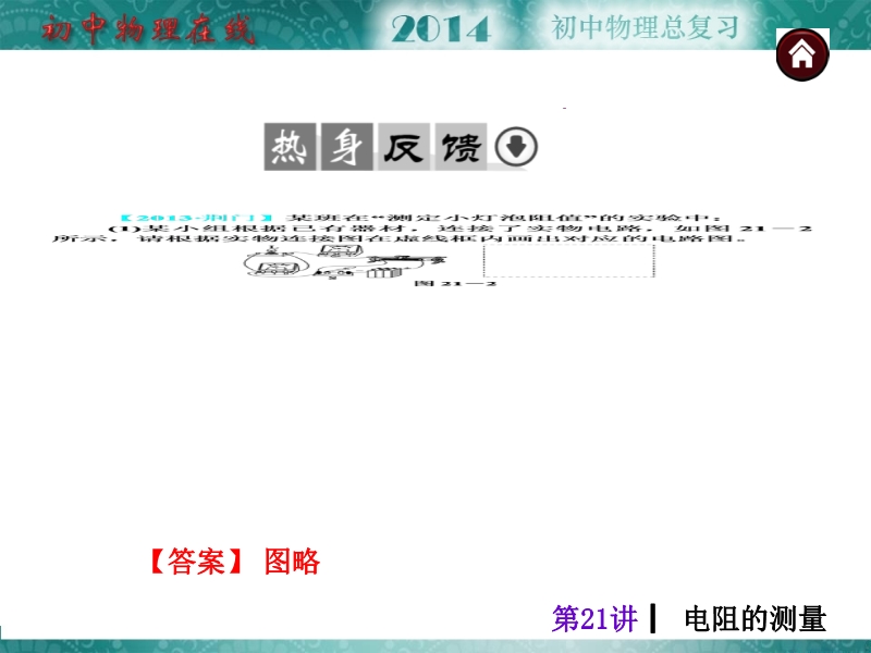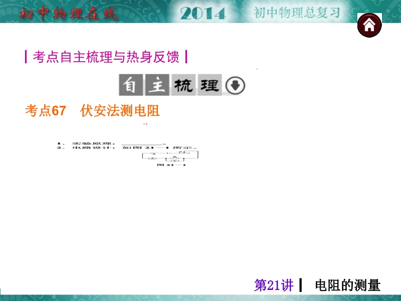 【内容简介】【中考夺分天天练】2014年人教版中考物理总复习:第21讲 电阻的测量课件共有 29 张幻灯片,课件“考点自主梳理”引导学生在课件自主复习的基础上,梳理本章主要知识要点伏安法测电阻,通过“热身反馈”展示2013年中考试题,以达到学以致用的目的,一内容般地这部分简单,难度不大,引导学生认识中考考察的方式,课件的重点“考向互动中考探究与方法归纳”精选典型和热点内容的2013中考试题,通过分析、归纳突破本章的难点和突出热点,“考题自主训练与名师预“自主练习,预测2014