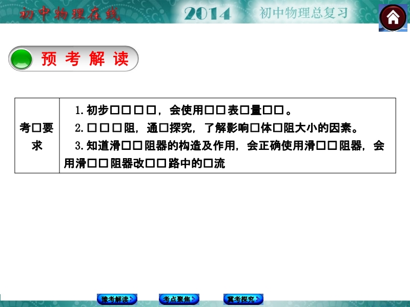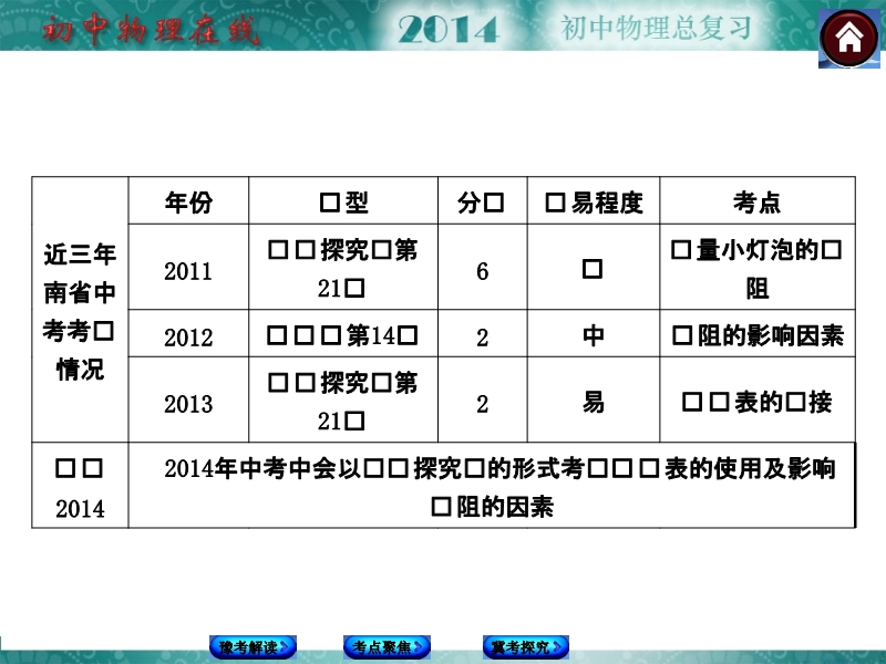 【内容简介】2014中考复习方案课件(河南专版):第17课时 电压 电阻,课件共有25张幻灯片。课件分三个板块:第一板块《预考解读》引导学生解读中考考纲,目前中考考什么,分析了近三年河南省中考题型、分值、难易程度和考点等,同时预测2014命题方向。第二板块《考点聚焦》复习了如下考点:电压 电压的测量及电压规律 电阻 变阻器,组织学生,进一步熟悉教材、重视双基的落实。课件的第三板块《豫考探究》,按考点分成几大类型,以2013中考试题为抓手组织学生复习,最后展望了中考试题的命题角度。课件设计合理科学,供2014年中考首轮复习参考使用。