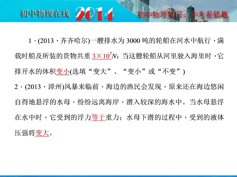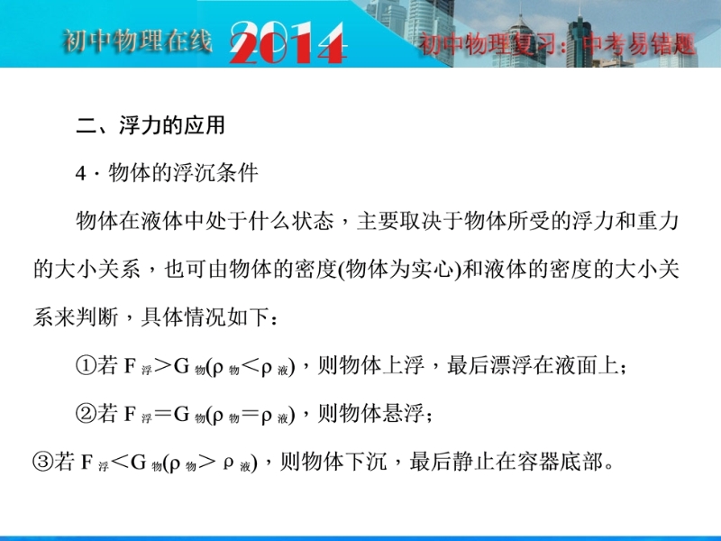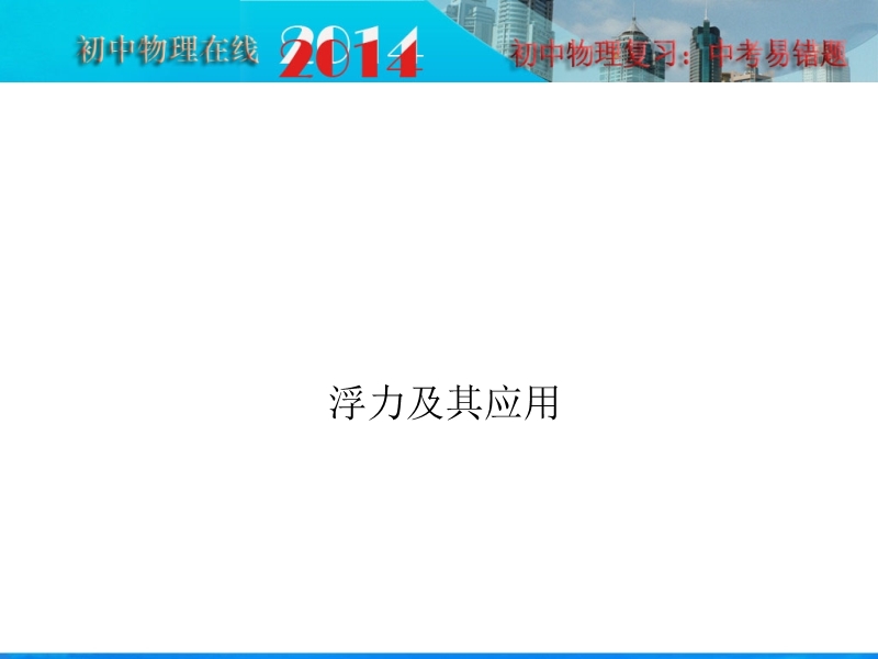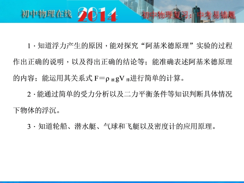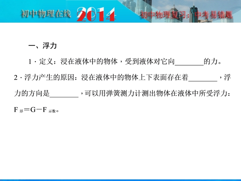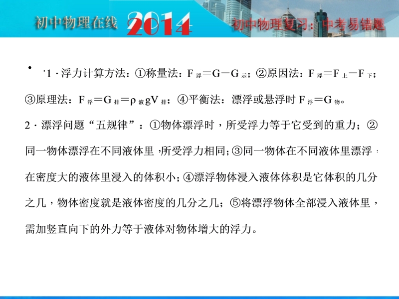 【内容简介】2014年人教版总复习(知识梳理+真题体验+考点透析+实验探究+易错档案):10.浮力及其应用,课件共32张ppt幻灯片,课件从四个环节组织复习:1.知识梳理:梳理本章重要知识点:“浮力及其计算 浮力的应用”2真题体验:精选了2011-2013年中考典型试题、同过解析提高学生运用知识的能力,3、考点透析;解读中考要点和热点,4、实验探究环节组织学生复习了本章的实验 5、易错梳理档案环节,组织学生回顾近几年中考,展示了中考易错题和容易出错的考点等