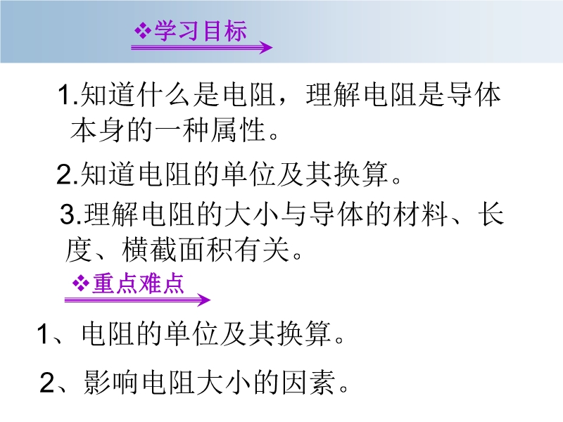 【内容简介】人教版:《16.3电阻》ppt+flash课件,课件共有23张幻灯片和2个内嵌动画。课件引导学生认识了导体对电流有阻碍作用,学习了电阻的定义、意义、单位,课件还引导学生猜想了电阻的大小可能与哪些因素有关,并通过实验探究了影响因素,同时动画模拟演示。