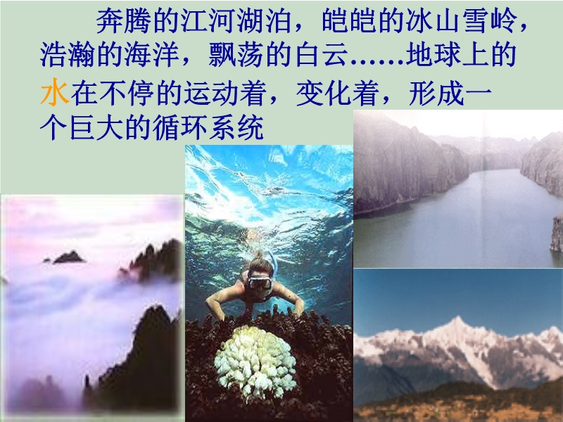 【内容简介】苏科版:《2.5水循环》ppt课件,共有28张幻灯片。课件展示了自然界中的水循环过程,引导学生讨论了在循环中发生的物态变化,认识了云、雨、雪等的形成过程,课件引导学生认识了水资源状况,让学生认识到节约用水的重要性等