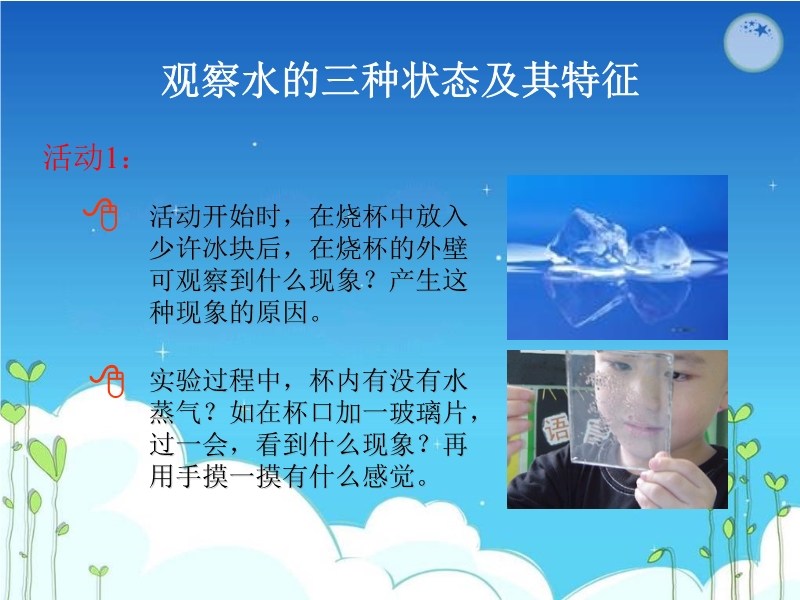 【内容简介】本课件以苏科版新教材第二章第一节《2.1 物质的三态 温度的测量》为基础制作,共有12张幻灯片。课件展示了酒精灯的使用方法,引导学生通过小实验认识了水存在的三种状态,并讨论了三种状态的特征。课件还引导学生学习了温度、温标的概念,展示了常用的温度计及原理,引导学生讨论了温度计的使用方法。最后引导学生讨论了“温室效应”、“热岛效应”的形成原因等。本课件可供教学“温度、物态变化”时参考使用。