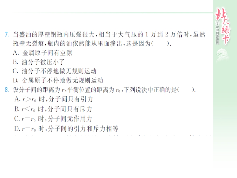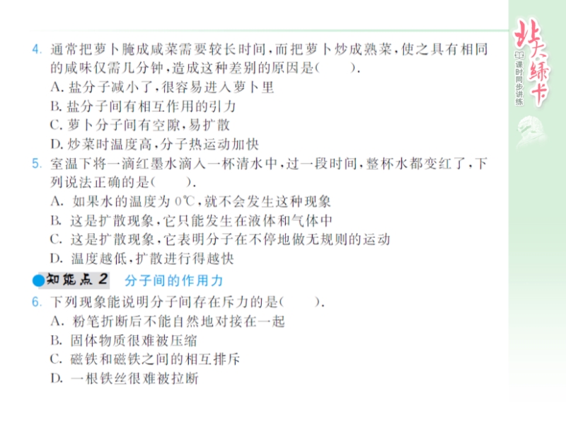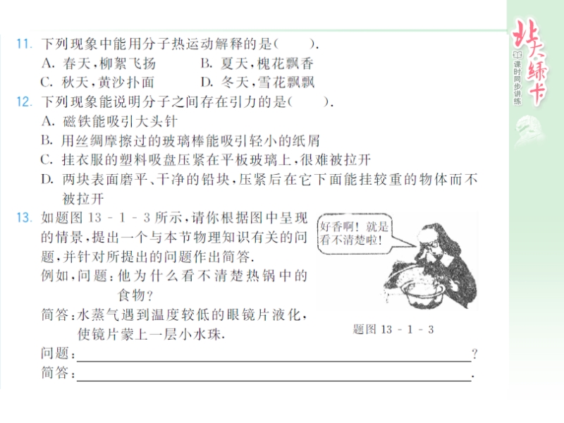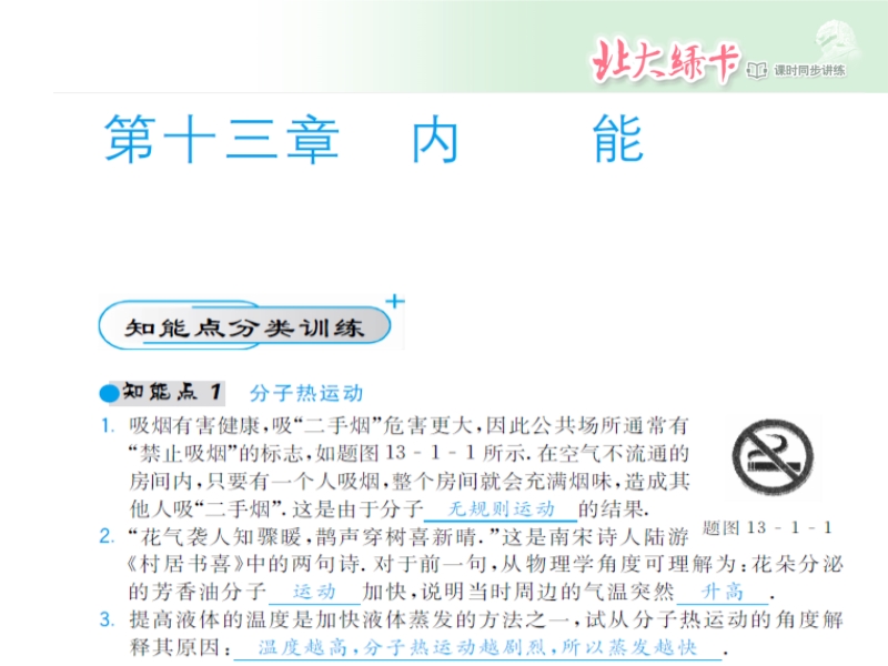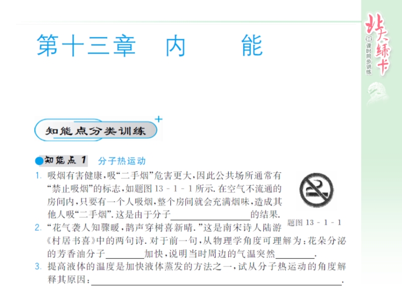 【内容简介】北师大:《第13章 内能》PPT讲练课件,课件共85张ppt幻灯片,按照知识点:分子的热运动、分子间的作用力等知识点,课件精编中考试题,归纳解题方法提高解题能力。