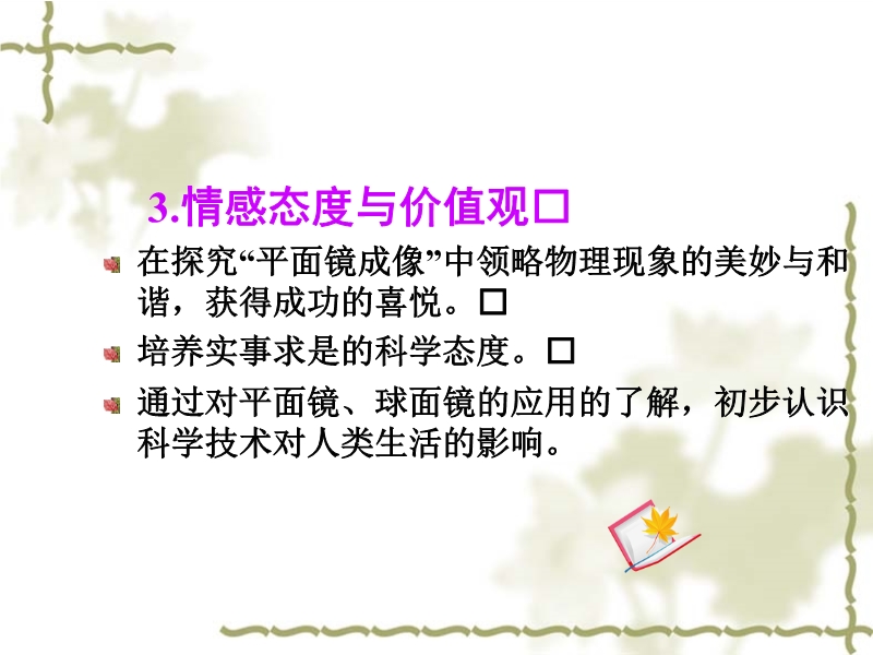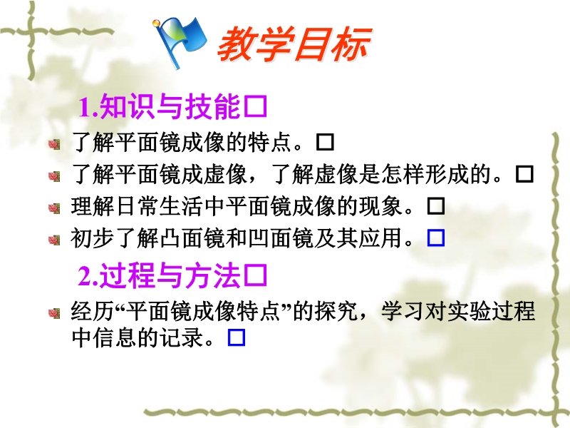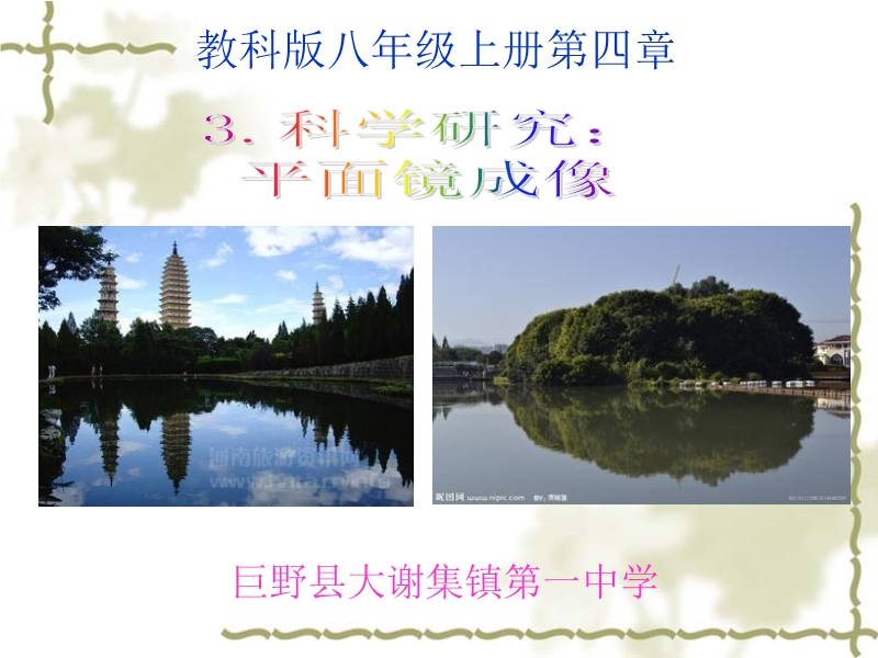 【内容简介】巨野县大谢集镇第一中学:教科版《3.科学研究:平面镜成像》ppt课件,共有33张幻灯片,并插入了一个flash动画。课件引导学生探究了平面镜成像的特点,并用flash动画模拟演示了平面镜成像的实验,课件还展示了平面镜成像的应用,精选了典型的习题等。