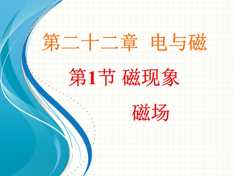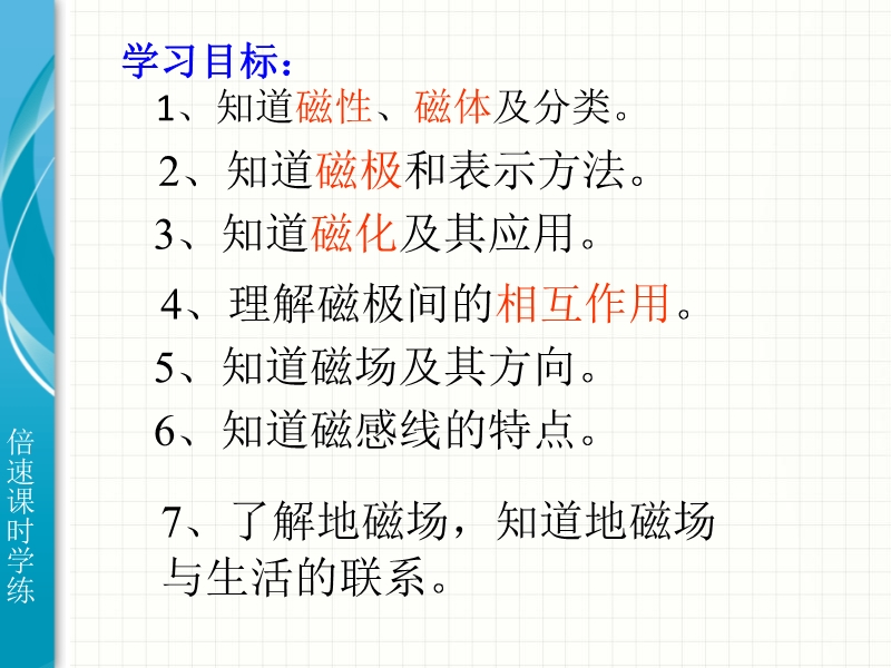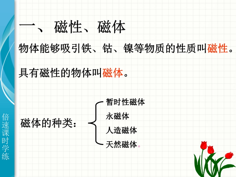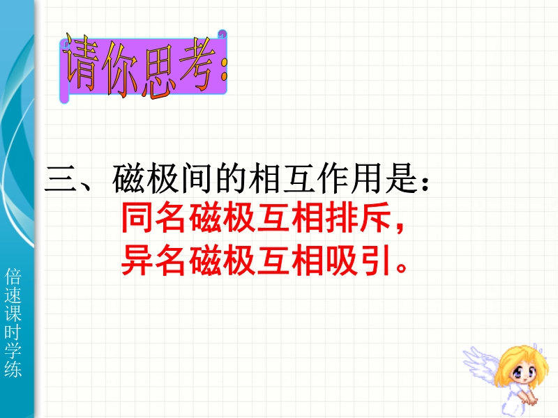 【内容简介】倍速系列人教版学练课件:《20.1磁现象 磁场》ppt课件,共有35张幻灯片。课件首先向学生展示了磁在生活中的重要应用,引导学生通过实验探究了磁体的基本性质,让学生认识了磁体的两极、去磁和磁化的概念等。课件最后重点认识磁场的概念和磁感线的认识。