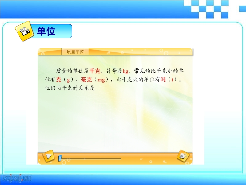 【内容简介】人教版《6.1质量》ppt+flash课件,共有41张幻灯片动画和3个flash。课件让学生认识了质量是物体的一个基本属性,让学生了解了它的单位的制定,并学习了质量的单位,展示了生活中一些物体的质量值,展示了生活中测量质量的工具,引导学生学习了如何使用托盘天平测量物体的质量等。