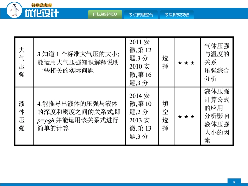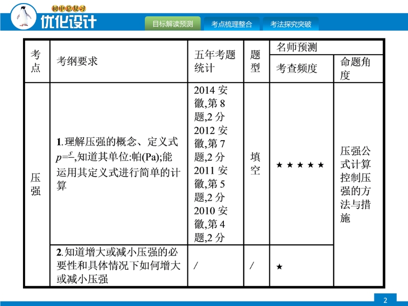 【内容简介】2015届中考复习:优化设计系列课件《第8课时 压强》ppt课件,课件共有23张幻灯片。课件分三个板块:目标解读预测,引导学生解读中考考纲,目前中考考什么,分析了10-14届年安徽省中考题型、分值、难易程度和考点等。第二板块考点梳理整合,按照考纲的考点分析考点:"压强、液体压强和大气压强" ,组织学生,进一步熟悉教材、重视双基的落实。课件的第三板块考法探究突破,通过精选近几年来中考试题提高学生运用知识的能力
