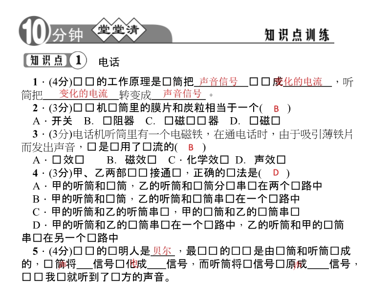 【内容简介】人教版:四清导航同步课件(日日清):《21.1现代顺风耳——电话》ppt课件,课件共有5张幻灯片,课件有如下几个环节,预习导航,主要对本节内容的基数知识和基本规律通过学生的预习,达到基本梳理;10分钟的堂堂清环节,按照知识点,精选经典试题,培养学生运用知识的能力,本环节复习的知识点有:电能、电能表和电功,;日日清环节,选用2014年部分中考试题提供学生自主解决,进一步提高运用知识的能力,注重知识的整合等。