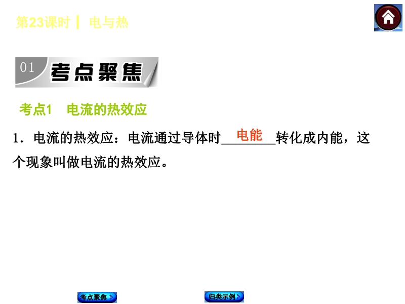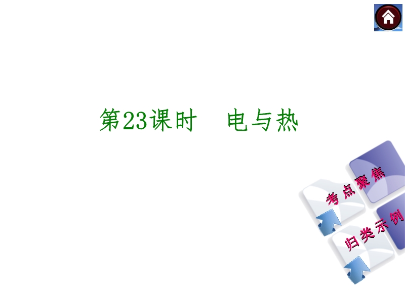 【内容简介】2015届人教版中考复习方案:《第23课时 电与热》ppt课件课件根据现行的人教版教材编辑的15届中考复习课件,课件共18张ppt幻灯片,课件分为如下几个环节组织复习:1.考点聚焦,按照如下考点:考点1 电流的热效应 考点2 焦耳定律 考点3 电热与电能的关系 ,组织学生复习本节基础知识点,课件主要通过填空形式再现基础知识点,同时通过点拨形式对该知识点的难、易错指导、辨析等。2.归类实例,课件总结中考考查知识点的类型,通过2014年中考试题的展示,解析和点评,总结方法,提高学生能力,课件最后通过方法集锦,突出重点、突破难点