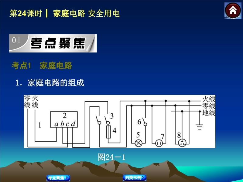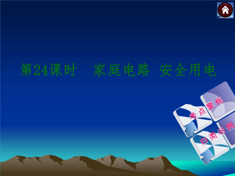 【内容简介】2015届人教版中考复习方案:《第24课时 家庭电路 安全用电》ppt课件,课件根据现行的人教版教材编辑的15届中考复习课件,课件共20张ppt幻灯片,课件分为如下几个环节组织复习:1.考点聚焦,按照如下考点:考点1 家庭电路 考点2 家庭电路中电流过大的原因 考点3 安全用电 ,组织学生复习本节基础知识点,课件主要通过填空形式再现基础知识点,同时通过点拨形式对该知识点的难、易错指导、辨析等。2.归类实例,课件总结中考考查知识点的类型,通过2014年中考试题的展示,解析和点评,总结方法,提高学生能力,课件最后通过方法集锦,突出重点、突破难点。