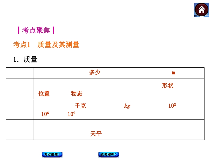 【内容简介】2015年安徽省中考复习方案:《第5课时+质量和密度》ppt课件,课件根据现行的人教版教材编辑的15届中考复习课件,课件共32张ppt幻灯片,课件分为如下几个环节组织复习:1.考点聚焦,按照如下考点:考点1 质量 考点2 密度 考点3 测量物体的密度 考点4 密度与社会生活,组织学生复习本节基础知识点,课件主要通过填空形式再现基础知识点,同时知识纵横,对知识点进行横向和纵向的对比,借助表格和图像加深对教材前后联系等。2.皖考探究,结合安徽省近几年来的中考考试方向归纳考试方向,同时解析近几年的安徽中考试题,把握考试方向,课件最后总结了方法通过方法集锦归纳总结方法,进一步突出考试的热点