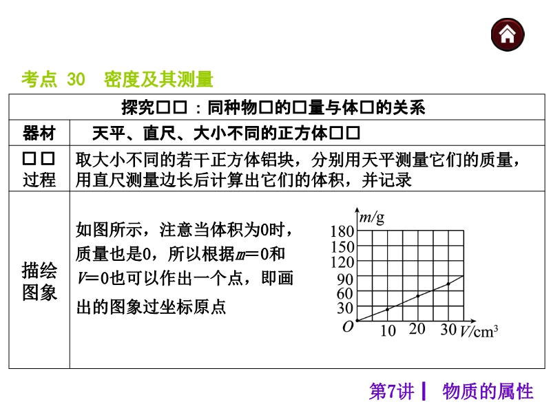 【内容简介】【中考夺分天天练】2015年中考物理(安徽)总复习课件:《第7讲 物质的属性》ppt课件,课件根据现行的人教版教材编辑的15届中考复习课件,课件共54张ppt幻灯片,课件分为如下几个环节组织复习:1.考点自主梳理与热身反馈,按照如下考点:物质的属性 质量及其测量 密度及其测量 ,组织学生复习本节基础知识点,课件主要通过填空形式再现基础知识点,热身反馈,精选中考试题,试题注重双基的落实。2.考向典例解读与技巧点拨,解读安徽省近几年来的中考试题,通过审题要点、分析思路和答题有据,引导学生如何答题总结知识和能力,课件最后通过名师预测,预测2015年中考。