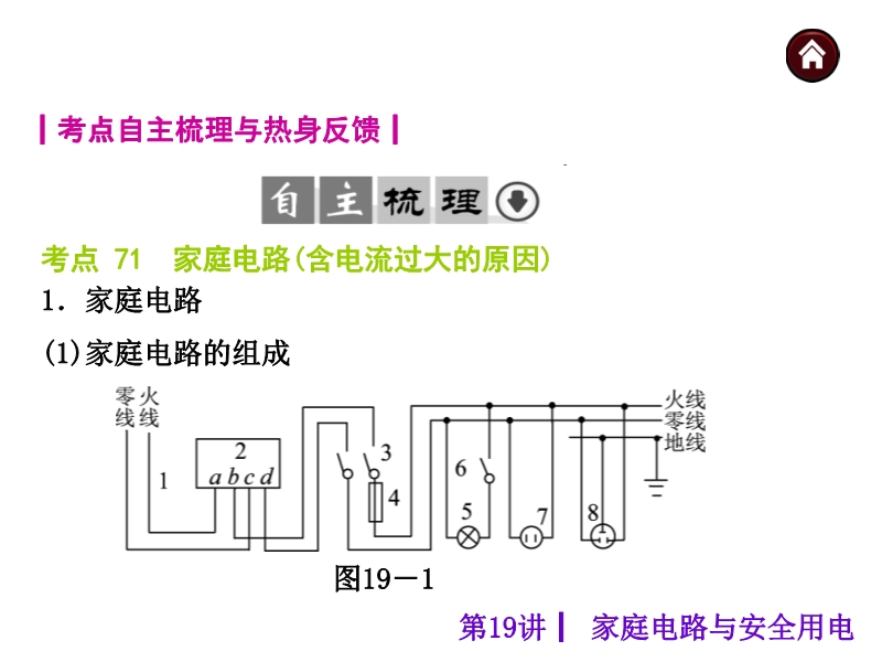 【内容简介】【中考夺分天天练】2015年中考物理(安徽)总复习课件:《第19讲 家庭电路与安全用电》ppt课件,课件根据现行的人教版教材编辑的15届中考复习课件,课件共39张ppt幻灯片,课件分为如下几个环节组织复习:1.考点自主梳理与热身反馈,按照如下考点:家庭电路的组成 家庭电路中电流过大的原因、安全用电,组织学生复习本节基础知识点,课件主要通过填空形式再现基础知识点,热身反馈,精选中考试题,试题注重双基的落实。2.考向典例解读与技巧点拨,解读安徽省近几年来的中考试题,通过审题要点、分析思路和答题有据,引导学生如何答题总结知识和能力,课件最后通过名师预测,预测2015年中考。