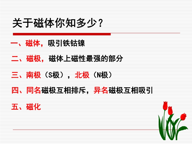 【内容简介】优质课:人教版《20.1磁现象 磁场》《第二课时》ppt+视频+教案课件,课件作者:海南省三亚市榆林八一中学 高福琳。共有26张幻灯片。课件引导学生通过小实验探究了小磁针在磁体的不同位置的指向,认识了磁场的特点,并用图片展示了铁屑在磁体周围的分布,由此引入了磁感线的概念及作用,课件展示了几种常见的磁体周围的磁场分布及地磁场的分布。