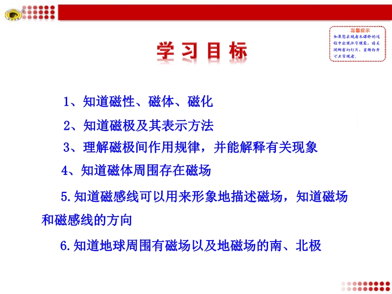 【内容简介】人教版:《20.1磁现象 磁场》ppt+视频课件,共45张幻灯片和1个视频。课件主要引导学生认识了磁体和磁体的性质,介绍了磁化和去磁的方法。课件展示了小磁针在磁铁周围的排列情况及铁屑在磁体周围的排列规律,让学生认识了磁体周围的磁场分布,讨论了磁场的性质等,课件最后通过视频展示了动物的罗盘等。