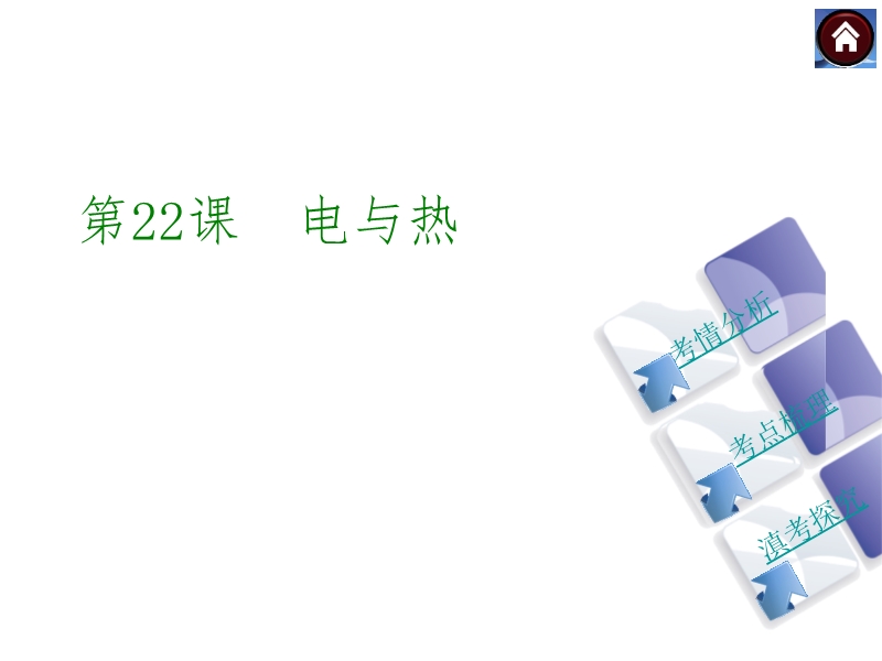 【内容简介】2015届云南省中考复习方案:《第22课时+电与热》ppt课件,课件共20张ppt幻灯片,课件分为如下几个环节组织复习:1.考情分析:考试要求,分析了中考考试要求;常见考试题型,列举了12-14年考试的题型;2015年考试预测,预测了2015年中考考试的热点。2、考点梳理,引导学生通过填空的形式,再现主要知识要点:电流的热效应 电热的利用和防止3、知识纵横:通过知识纵横,将教材相近的知识点进行对比:纯电阻电路与非纯电阻电路中的公式应用4、滇考探究:通过例题的形式,精选云南中考试题进行解读、剖析、点拨,课件热点和易错点进行方法的归类:纯电阻电路与非纯电阻电路中的电功和电热。