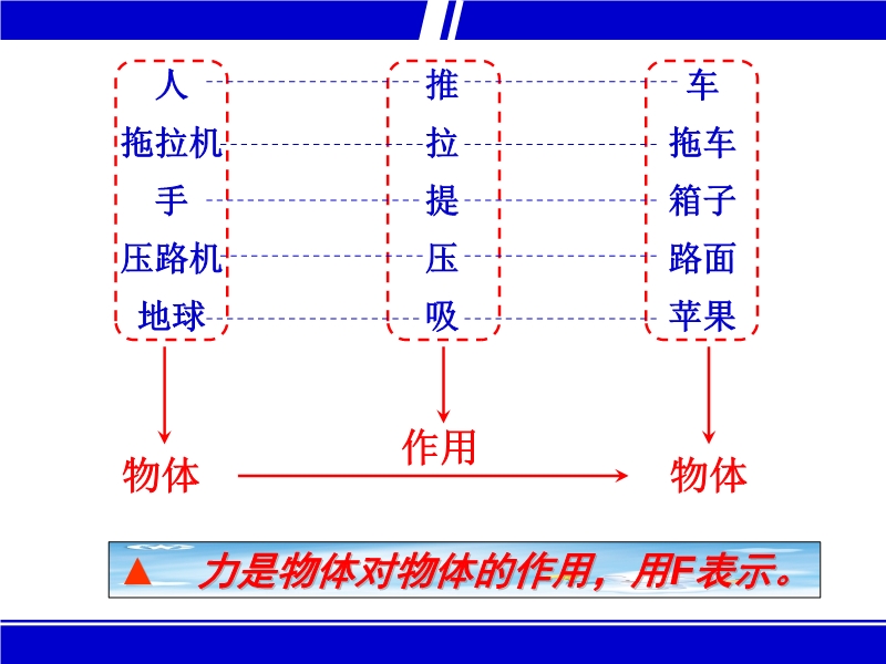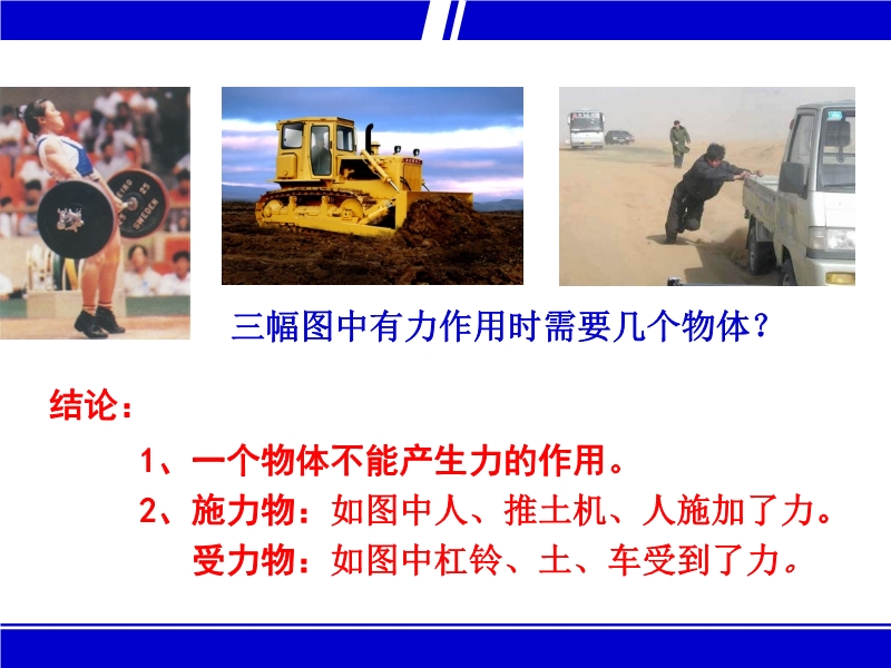 课件分两部分:一、什么是力?——通过生活中的图片、演示实验以及学生的亲身体会,理解力是物体对物体的相互作用,同时理解清楚什么是施力物体、受力物体;二、力的作用效果——通过视频观看和学生的亲生体会,让学生明白如何判断力的存在,知道力的作用效果有两个:改变物体的运动状态和改变物体的形状