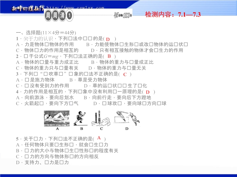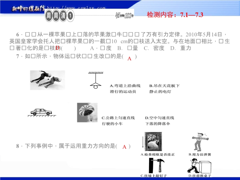 【内容简介】人教版周周清:《第七章-第九章》PPT课件,课件共有25张幻灯片,课件从结构上主要设计选择题、填空题和实验计算题,按照教材内容,将教材分割成几个部分,同时精选近几年中考试题(题量大约14道左右,同时提供了答案),对照考点加强训练,培养学生运用知识的能力,注重知识的整合,教师可以将ppt内容转化成word形式,制成学案可以课前让学生独立换成效果更佳。