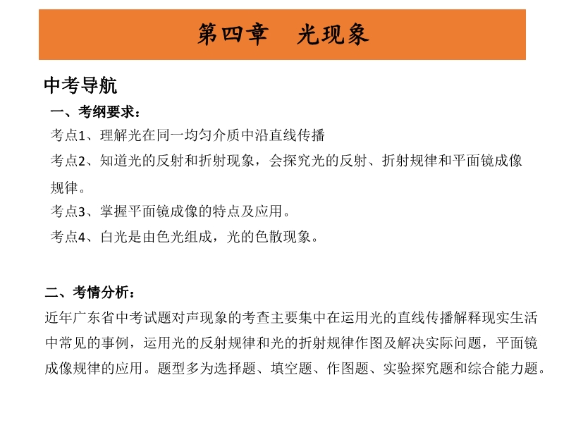 【内容简介】广东省2015中考物理冲刺复习课件:《第4章+光现象》PPT课件,课件共有19张幻灯片,课件首先是中考导航环节,根据考纲要求列出考点同时分析了考情;第二环节是考点梳理,通过填空的形式梳理本章基础知识要点;课件第三个环节是重难点突破和重点实验剖析,对本章的“一、光的直线传播、光的反射、光的折射现象二、光的反射定律和光的折射规律及其作图 三、用平面镜成像特点作图 实验一:探究光的反射定律 实验二:探究光折射时的特点实验三:探究平面镜成像的特点 ”等考点采用讲练结合突出重点,突破难点;课件最后精选广东省中考试题和其他省市部分中考试题进行精练,进一步提高解题能力。