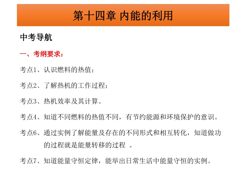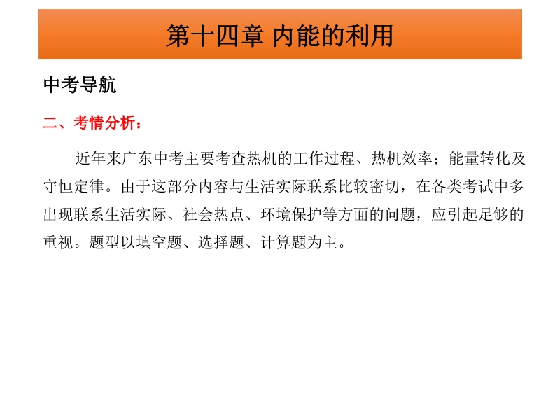 【内容简介】广东省2015中考物理冲刺复习课件:《第14章+内能的利用》PPT课件,课件共有17张幻灯片,课件首先是中考导航环节,根据考纲要求列出考点同时分析了考情;第二环节是考点梳理,通过填空的形式梳理本章基础知识要点;课件第三个环节是重难点突破以及重点实验剖析,对本章的“ 一、认识燃料的热值二、热机的工作过程三、热机的效率四、能量的转化与守恒 剖析重点实验 探究不同燃料的热值大小”等考点采用讲练结合突出重点,突破难点;课件最后精选广东省中考试题和其他省市部分中考试题进行精练,进一步提高解题能力。