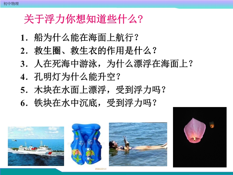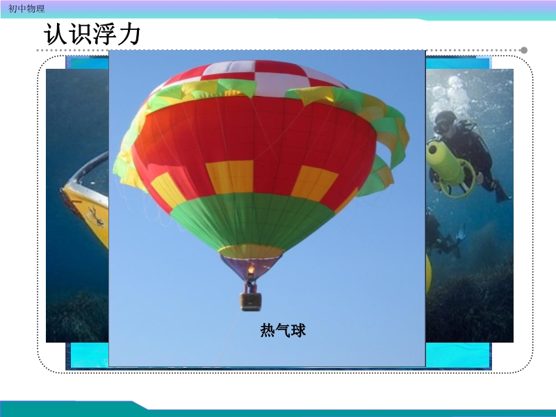 【内容简介】人教版:《10.1浮力》ppt课件,共有15张幻灯片。课件引导学生通过图片演示体验了浮力的存在,并引导学生利用弹簧测力计进行了测量,认识了浮力的方向,课件引导学生认识了液体和气体对浸在其中的物体都有浮力,并讨论了浮力产生的原因同时动画演示了实验的过程等。