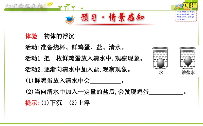 【内容简介】沪粤版金榜学案配套课件:《9.3研究物体的浮沉条件》PPT课件,课件,35张幻灯片,课件设置环节:一、预习 情感感知,设置了实验:体验 物体的浮沉 ,再此基础上引发学生思考教材的重难点,二、探究合作释疑,小组合作解决实际问题,从而总结归纳基本定义和概念等,三、题例精析,按照中考考点:物体浮沉条件的应用 。运用中考试题,总结方法,归纳解题思路,最后是基础达标,精选了8道试题,都有分析的过程,该课件供教师备课参考使用。