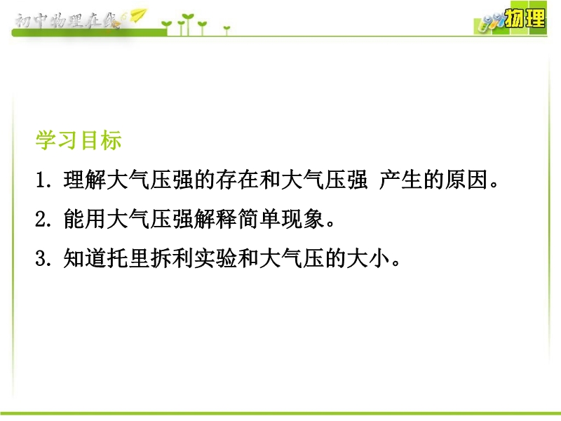 【内容简介】人教版《9.3大气压强》PPT课件,共有71张幻灯片。课件引导学生认识了大气压强的产生,课件通过类比液体压强,引导学生观察和列举日常生活中的事例说明了大气压强的存在,并熟悉了大气压强的测量方法、计算方法及大气压的应用课件设计完整、重点突出。
