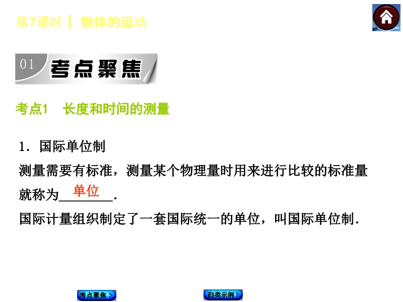 【内容简介】【中考复习方案】2015年江苏省中考物理复习课件:《第7课时 物体的运动》PPT课件,课件共张25张幻灯片,课件从如下几个方面组织学生复习:1.考点聚焦,引导学生复习了:长度的测量、机械运动等,课件主要通过填空的形式再现本章主要知识点,引导学生进一步熟悉教材,落实双基。2、归类实例,根据知识点,列举了大量中考试题,提高学生的解题能力,每道试题都进行了解析和点评,培养学生运用知识解决问题的能力。同时对解题的方法进行归类总结等