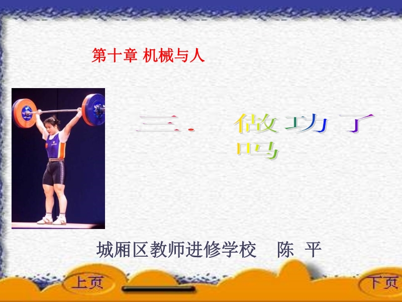 【内容简介】城厢区教师进修学校:沪科版《10.3做功了吗》ppt课件,共有25张幻灯片。课件引导学生通过分析生活中的具体的实例让学生认识了什么是做功,并讨论了做功的必要条件,展示了哪些情况下不做功,课件还引导学生讨论了怎样计算功的大小,学习了功的单位及做功的意义等。