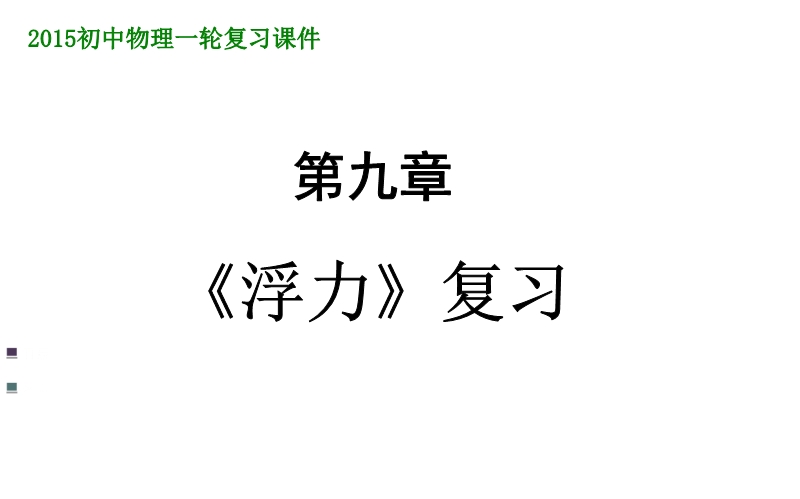 【内容简介】2015年中考复习:沪科版《第九章 浮力》PPT课件,课件共由54张幻灯片组成.教学设计科学,重点突出。内容主要包括:理解了浮力、阿基米德原理、浮力产生的原因、物体的浮沉条件、计算浮力的方法和浮力的应用等,课件精选经典试题,提高学生运用知识的能力。